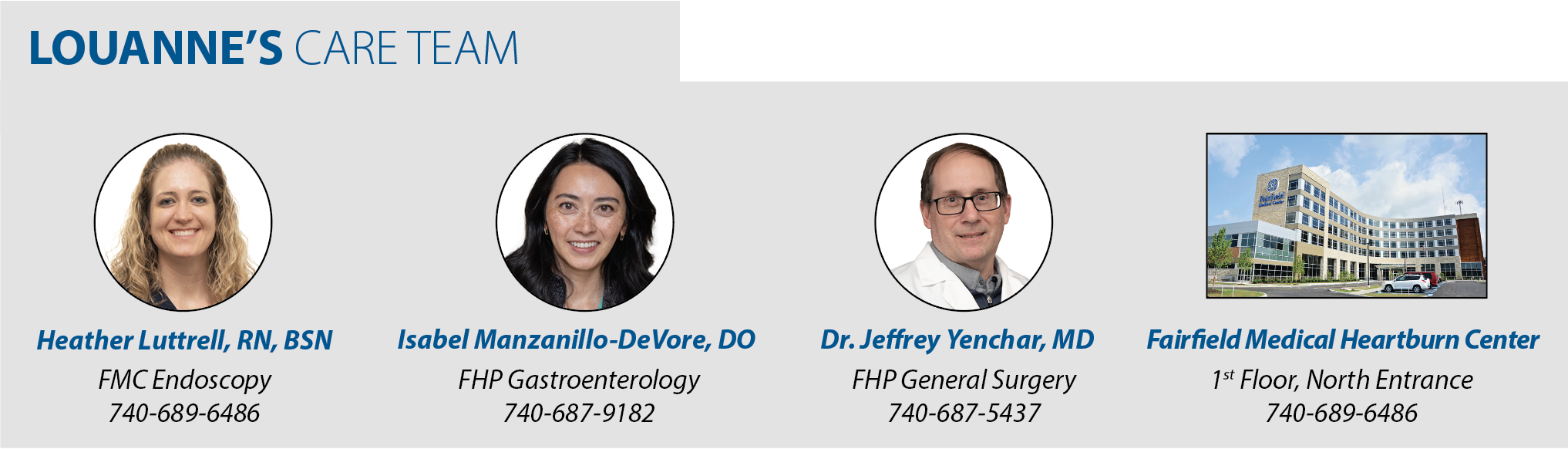 For Louanne, meeting with Heather and the Fairfield Medical Heartburn Center helped her gain clarity around the diagnosis. During their initial visit, they talked through what was happening, why it was happening, and how to manage or prevent future complications associated with GERD. In addition to understanding the disease process and how her anatomy played a role, Louanne also learned the importance of taking heartburn medications correctly as well as key lifestyle changes to help reduce reflux.