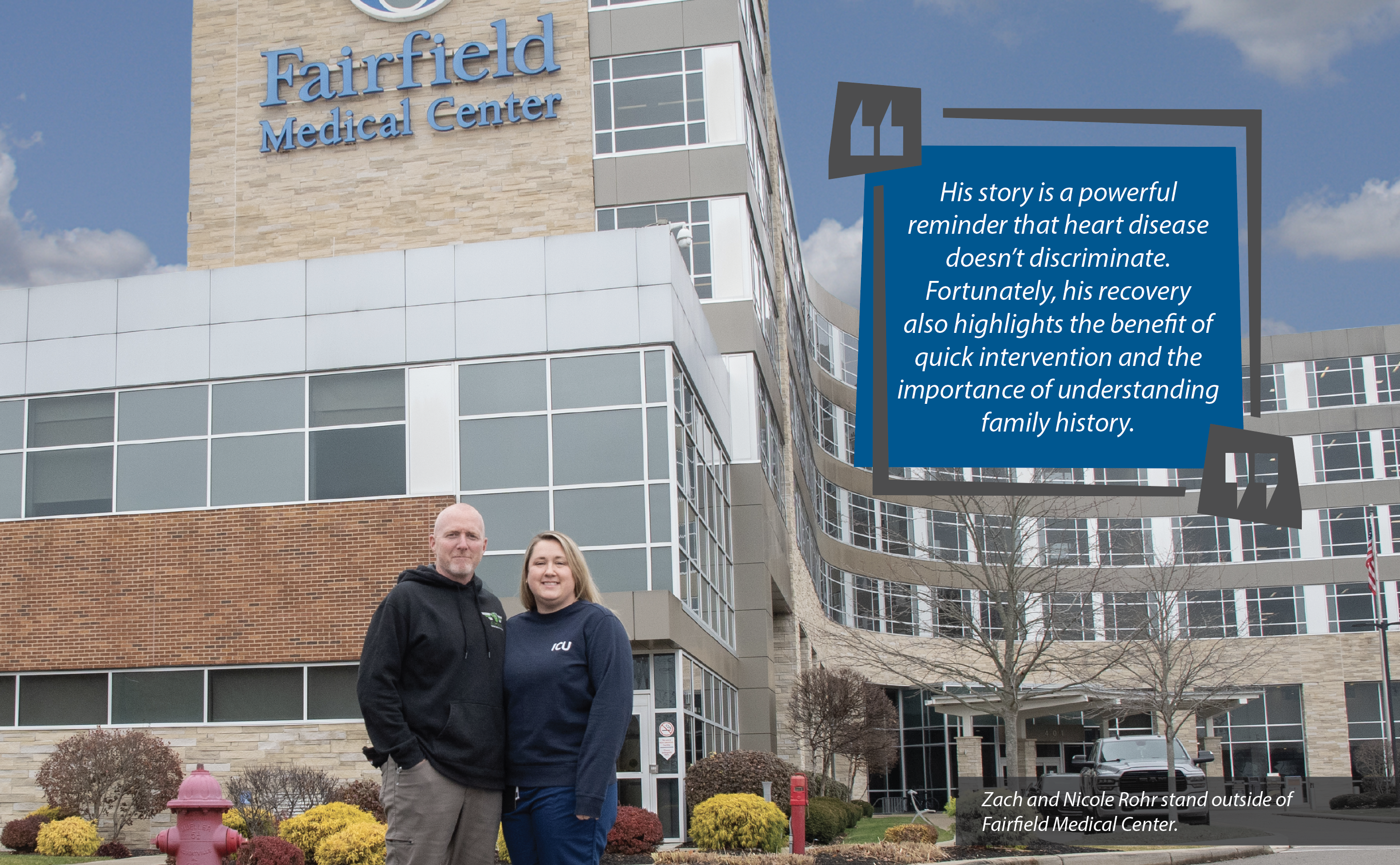 Nicole didn’t waste any time. She immediately called 911 and kept close tabs on Zach’s condition, preparing for the worst as his smart watch showed his heart rate was dropping and his complexion began to gray. She’s no stranger to high-stress medical situations, but Nicole admitted that those moments in her home were more terrifying than any she had experienced in the intensive care unit. With their home located in the middle of Lancaster, paramedics arrived within three minutes of her call. By 6 a.m., Zach was in Fairfield Medical Center’s catheterization lab, where interventional cardiologist Andrew Stiff, MD, got to work on opening two cardiac arteries that were 100% blocked.