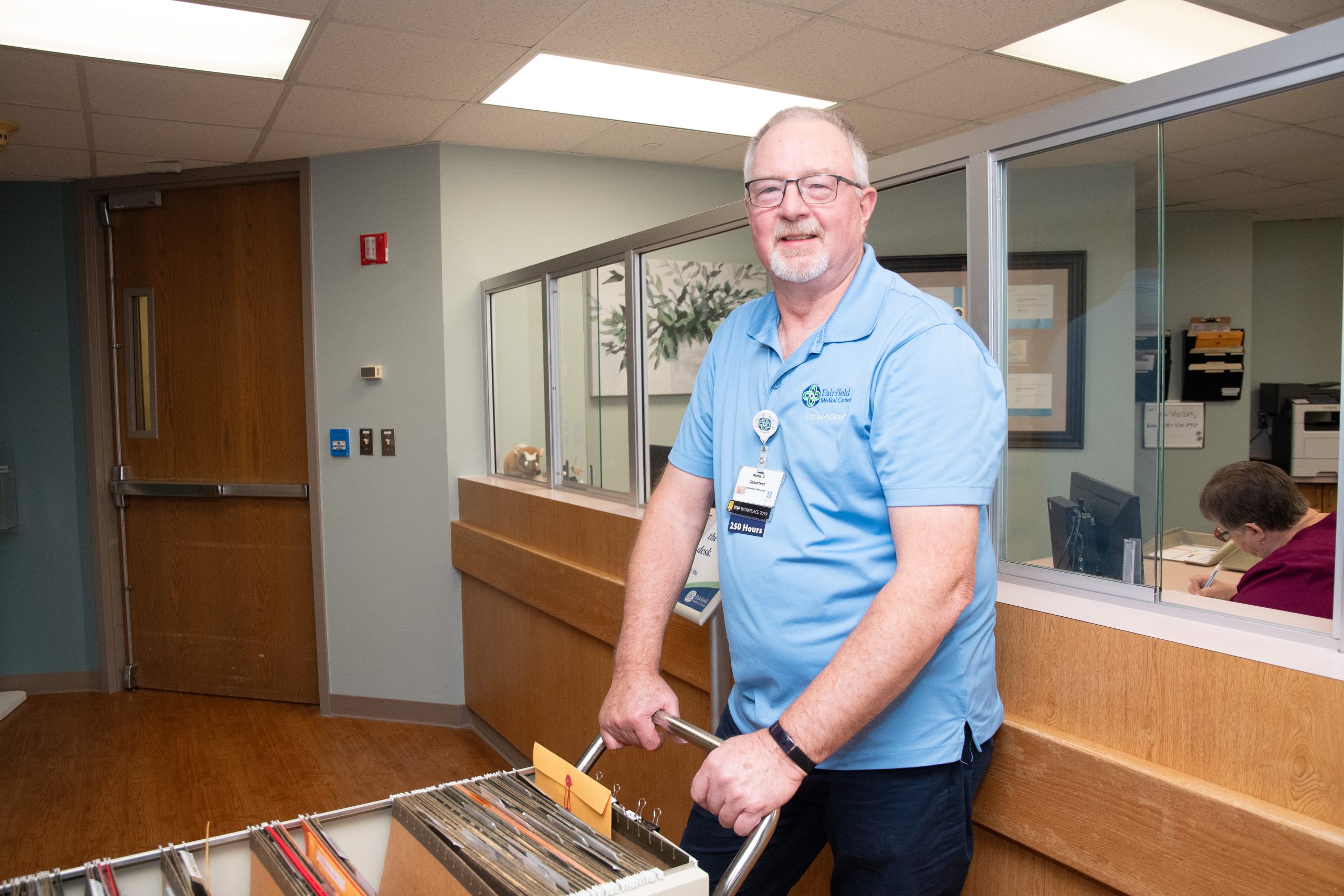 In addition to forging connections with other stroke survivors, the Neuro Support Group also introduced Mark to a new hobby – volunteering at Fairfield Medical Center. Mark became a volunteer after he was asked if he would be willing to call other members of the group each month to remind them of the next meeting. He now helps deliver mail to offices throughout the Main Campus, and recently celebrated a milestone of 250 volunteer hours served. “I’m scheduled to volunteer once a week, but I sometimes do more than that if they need my help because I absolutely love it,” Mark said.